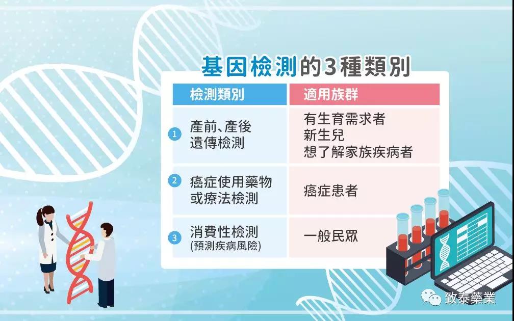 所有癌症中约有5-10%与家族遗传或遗传的基因突变有关,某些类型(主要是乳腺癌,卵巢癌,结肠直肠癌和前列腺癌)会受到基因的强烈影响,并可能在家庭中传播。基因测试可分为治疗及预防两个目的:预防罹患癌症的概率和帮助医生实施不同治疗方案: 像常见EGFR、ALK与BRAF基因突变已有靶向药物治疗。