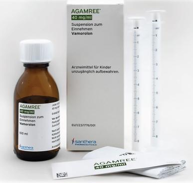 AGAMREE为口服混悬液剂型,规格为40mg/ml,属于新型解离型皮质类固醇。其化学结构在9:11位置将羟基改变为碳-碳双键,这种结构修饰使其作用机制区别于传统皮质类固醇。