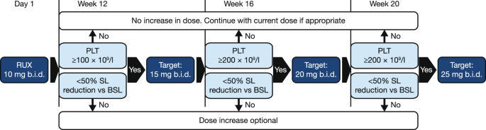 符合条件的患者在治疗的前 12 周接受 10 mg 口服剂量的鲁索替尼Jakavi,无论其基线时的血小板计数如何,之后根据血小板计数和疗效,允许滴定至多 25 mg 每天两次(图 2)。 )。ANC >0.5 × 10 9 /l 和 Hb ≥6.5 g/dl 的患者有资格增加剂量。血小板计数≥100 × 10 9 /l 至≤200 × 10 9 /l 的患者,目标剂量为 12 周 15 mg每天两次;对于血小板计数≥200 × 10 9 /l 的患者,从 16 周开始服用 20 mg 每天两次;从第 20 周起,允许血小板计数≥200 × 10 9 的患者服用 25 mg 每天两次/l 可触及的脾脏长度 (SL) 未减少 50%。对于那些 SL 从基线降低 50% 以上的患者,剂量增加是可选的。只要研究治疗有益,患者就会接受研究治疗,直至最后一位患者首次治疗后 48 周。