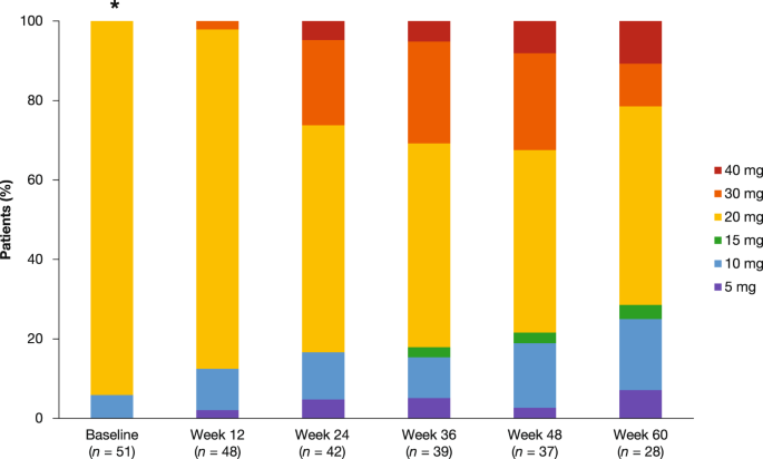 在研究期间,鲁索替尼的中位日剂量为 20(范围 8-36)mg,中位暴露时间为 62.6(范围 3-92)周。到第 24 周,26.2%(11/42 名患者)接受的每日总剂量≥30 mg,到第 48 周,有剂量数据的 37 名患者中有 12 名(32.4%)接受了每日 30 mg 或更多的剂量(图 2)。。在最终数据截止时,12.0% (6/50) 的患者接受了剂量增加,30.0% (15/50) 的患者维持了其起始剂量。大多数维持起始剂量的患者在第 12 周或更晚(11/15 名患者)实现了 ≥ 50% 的脾脏长度减少,2 名患者在第 12 周第一个方案要求增加剂量之前停止治疗。
