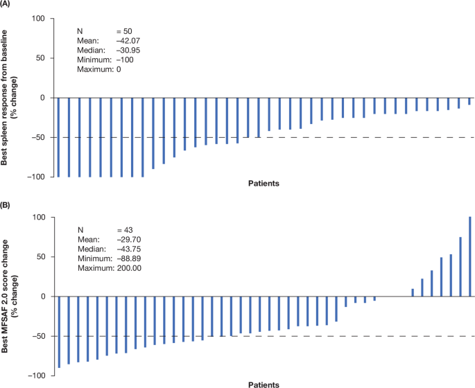 根据个体患者的脾脏长度 ( A ) 和 MFSAF 评分变化 ( B ) 的最佳反应。注意:患者 44 获得了 +200.7% 的最佳 MFSAF 评分。MFSAF 骨髓纤维化症状评估表。