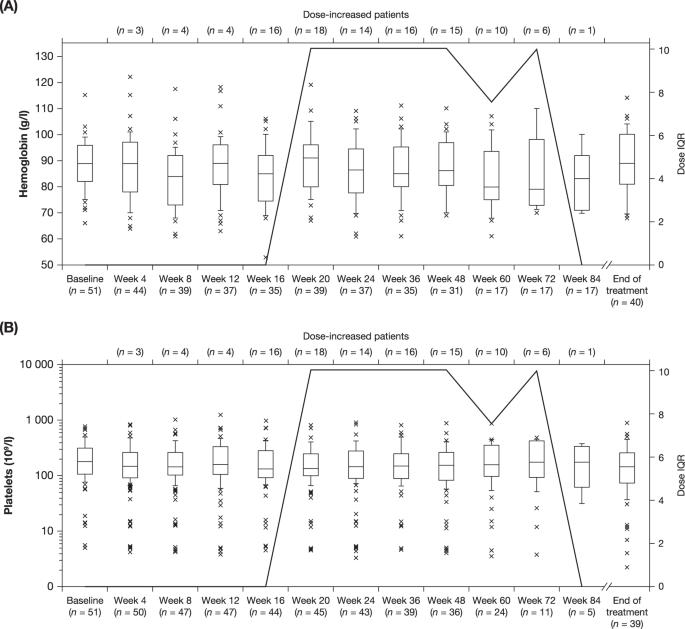 随着时间的推移,中位血红蛋白 ( A ) 和血小板 ( B ) 水平。方框表示第 25-75 个百分位数,中位日剂量表示为水平线。胡须表示第 10-90 个百分位数。不显示超出此范围的值。X 标记表示高于 Q3 的 IQR 的 1.5 倍和低于 Q1 的 IQR 的 3 倍。实线表示每日总剂量自起始剂量变化的 IQR。IQR四分位距,Q1第一四分位数;Q3 第三个四分位数。
