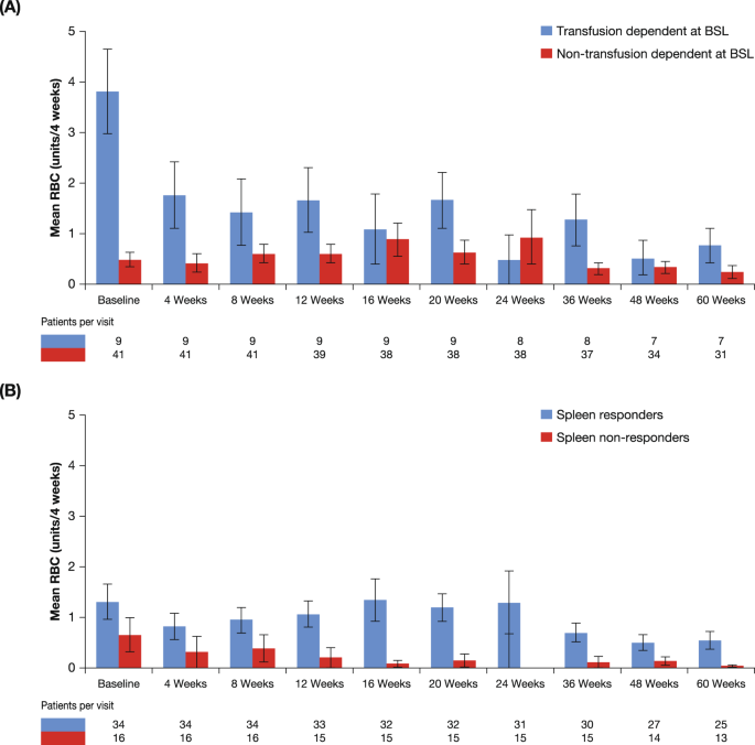 研究期间在基线时依赖输血或不依赖输血的患者 ( A ) 和研究期间任何时间的脾响应者和非响应者 ( B ) 中接受的 RBC 单位平均数。BSL 基线脾脏长度;红细胞红细胞。