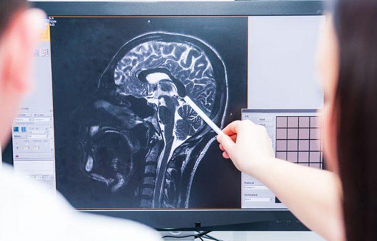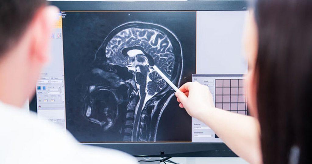 Doctors consider and discuss magnetic resonance image (MRI) of the brain. Back view, selective focus